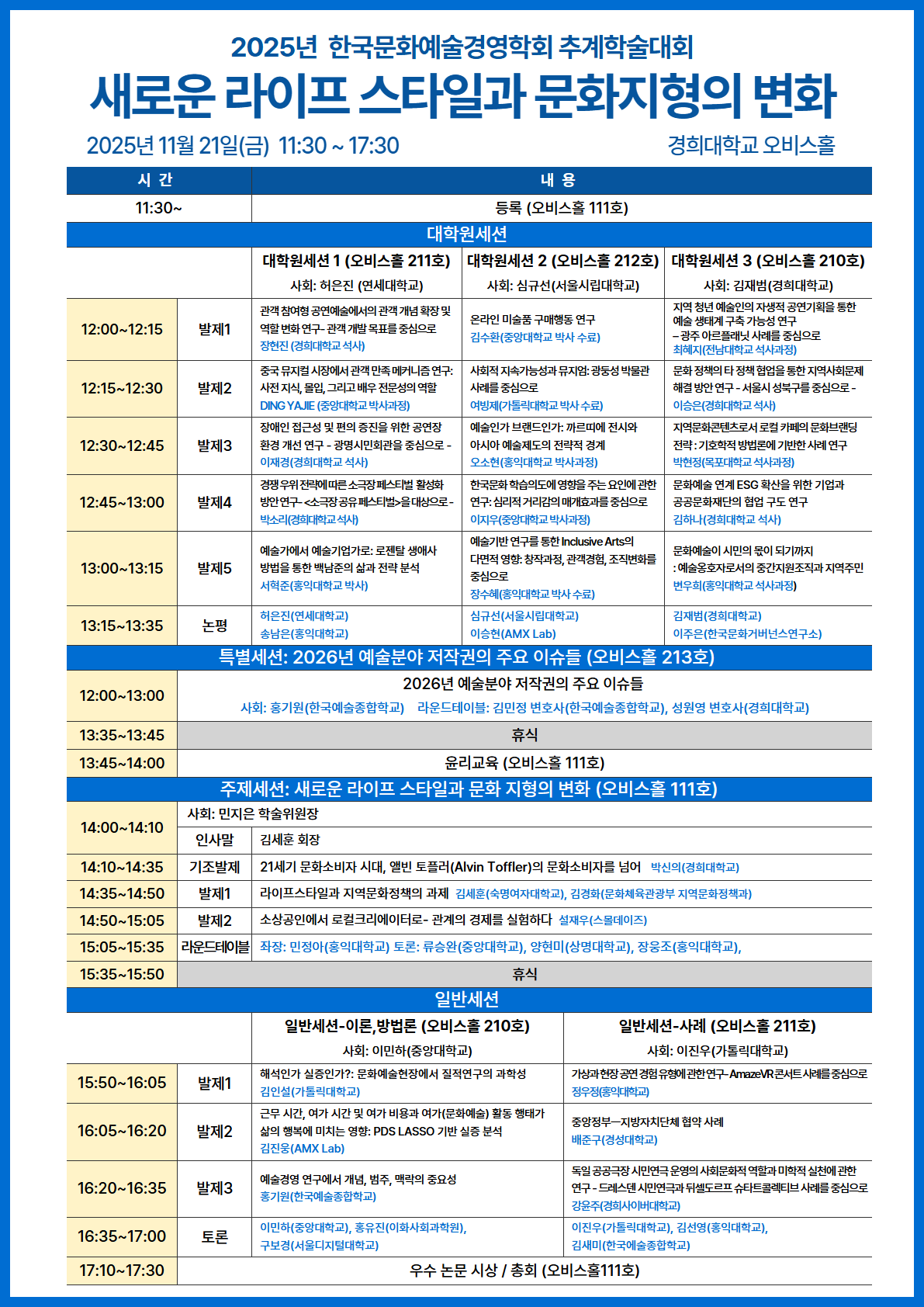 À̹ø Çмú´ëȸ´Â ÇâÀ¯¿Í ¼Òºñ°¡ °áÇյǴ Çö»óÀ» ¡®¶óÀÌÇÁ½ºÅ¸ÀÏ¡¯À̶ó´Â Â÷¿ø¿¡¼ Á¶¸ÁÇϰí, ÀÌ·¯ÇÑ ¶óÀÌÇÁ½ºÅ¸ÀÏÀÇ º¯È°¡ ÇâÈÄ ¹®È¿¹¼ú°æ¿µ ¿µ¿ª¿¡ ¹ÌÄ¥ ¿µÇâµéÀ» ³íÀÇÇØ º¸´Â ÀÚ¸®°¡ µÉ °ÍÀÔ´Ï´Ù. Çй®Àû ¿¬±¸¿Í ÇöÀåÀÇ °æÇèÀÌ ¸¸³ª´Â ÀÚ¸®¸¦ ÅëÇØ »õ·Î¿î ¹®È ÆÐ·¯´ÙÀÓÀÇ Àǹ̸¦ ¼ºÂûÇϰí, ¾ÕÀ¸·ÎÀÇ ¹æÇâÀ» ¸ð»öÇÏ´Â ±ÍÇÑ ½Ã°£ÀÌ µÇ±â¸¦ ¼Ò¸ÁÇÕ´Ï´Ù.