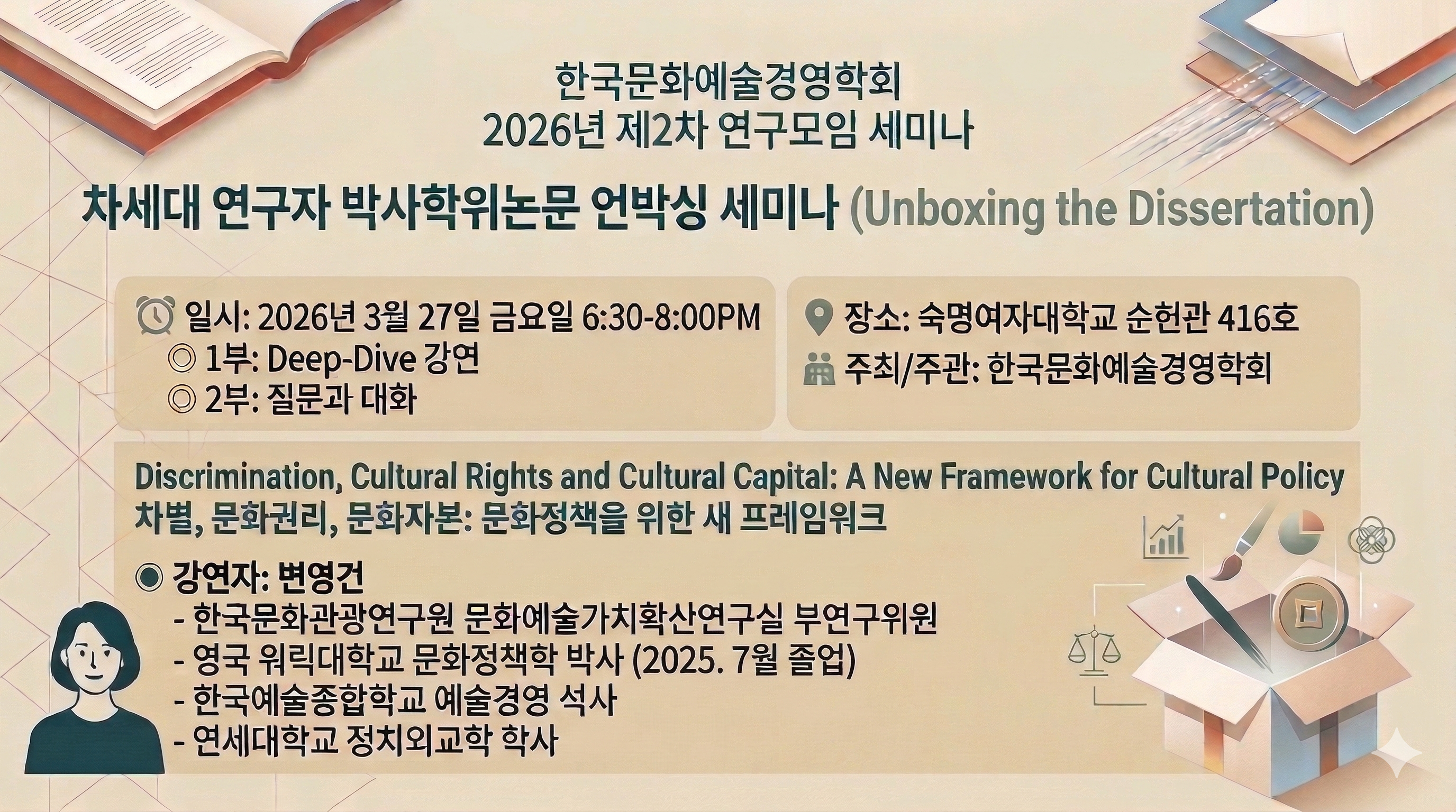 Çѱ¹¹®È¿¹¼ú°æ¿µÇÐȸ 2026³â Á¦2Â÷ ¿¬±¸¸ðÀÓ ¼¼¹Ì³ª ÁøÁ¤ÇÑ ¿ì¼ö ³í¹®Àº ¿Ï¼ºµÈ °á°ú°¡ ¾Æ´Ï¶ó, ²÷ÀÓ¾ø´Â ¼öÁ¤°ú À¯±âÀûÀÎ ¿¬°è °úÁ¤ ¼Ó¿¡¼ ź»ýÇÕ´Ï´Ù. Çѱ¹¹®È¿¹¼ú°æ¿µÇÐȸ°¡ ÁÖ°üÇÏ´Â 2026³â Á¦1Â÷ ¿¬±¸¸ðÀÓ ¼¼¹Ì³ª¿¡¼´Â ¾ö¼±µÈ ÃֽŠ¹Ú»çÇÐÀ§ ³í¹®À» ´ë»óÀ¸·Î, ÃÖÁ¾ ¿ÏÁ¦Ç°ÀÌ ¾Æ´Ñ ¿¬±¸ÀÇ ±¸Á¶È¿Í ³í¸®Ã¼°èÀÇ ±¸Ãà °úÁ¤À» ÇϳªÇϳª ¶â¾îº¸¸ç ½Éµµ ÀÖ°Ô ºÐ¼®ÇÏ´Â ÀÚ¸®¸¦ ¸¶·ÃÇß½À´Ï´Ù. ³í¹®ÀÇ ±¸Á¶ÈµÈ ³í¸®Àû ü°è°¡ ¾î¶»°Ô ±ðÀÌ°í ´Ùµë¾îÁ® ¿Ï¼ºµÇ´ÂÁö ±× »ý»ýÇÑ ÇöÀåÀ» ¸ñ°ÝÇϰí, ¿©·¯ºÐÀÇ ¿¬±¸ ¿©Á¤¿¡ ½ÇÁúÀûÀÎ ¸¶Ä§Ç¥¸¦ ÂïÀ» ¼ö ÀÖ´Â Àü·«À» ¾ò¾î°¡½Ã±æ ¹Ù¶ø´Ï´Ù. Â÷¼¼´ë ¿¬±¸ÀÚ ¹Ú»çÇÐÀ§³í¹® ¾ð¹Ú½Ì ¼¼¹Ì³ª (Unboxing the Dissertation) ¡á ÀϽÃ: 2026³â 3¿ù 27ÀÏ ±Ý¿äÀÏ 6:30-8:00PM ¡Ý 1ºÎ: Deep-Dive °¿¬ ¡Ý 2ºÎ: Áú¹®°ú ´ëÈ ¡á Àå¼Ò: ¼÷¸í¿©ÀÚ´ëÇб³ ¼øÇå°ü 416È£ ¡á ÁÖÃÖ/ÁÖ°ü: Çѱ¹¹®È¿¹¼ú°æ¿µÇÐȸ Discrimination, Cultural Rights and Cultural Capital: A New Framework for Cultural Policy Â÷º°, ¹®È±Ç¸®, ¹®ÈÀÚº»: ¹®ÈÁ¤Ã¥À» À§ÇÑ »õ ÇÁ·¹ÀÓ¿öÅ© ¡Ý °¿¬ÀÚ: º¯¿µ°Ç - Çѱ¹¹®È°ü±¤¿¬±¸¿ø ¹®È¿¹¼ú°¡Ä¡È®»ê¿¬±¸½Ç ºÎ¿¬±¸À§¿ø - ¿µ±¹ ¿ö¸¯´ëÇб³ ¹®ÈÁ¤Ã¥ÇÐ ¹Ú»ç (2025.7¿ù Á¹¾÷) - Çѱ¹¿¹¼úÁ¾ÇÕÇб³ ¿¹¼ú°æ¿µ ¼®»ç - ¿¬¼¼´ëÇб³ Á¤Ä¡¿Ü±³ÇÐ Çлç ![]() |